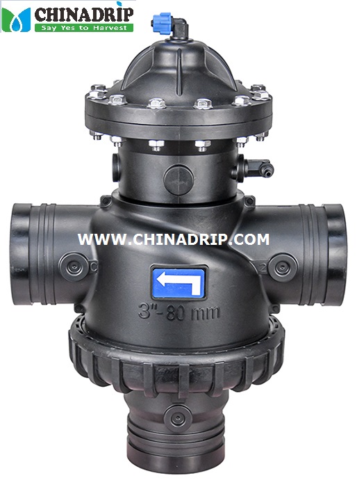 1. Комбинированный из нескольких. Этот клапан представляет собой трехходовой гидравлический клапан Т-образной формы с двухкамерным гидравлическим приводом и мембранным приводом, который подходит для различных автоматических обратных промывок систем фильтрации.